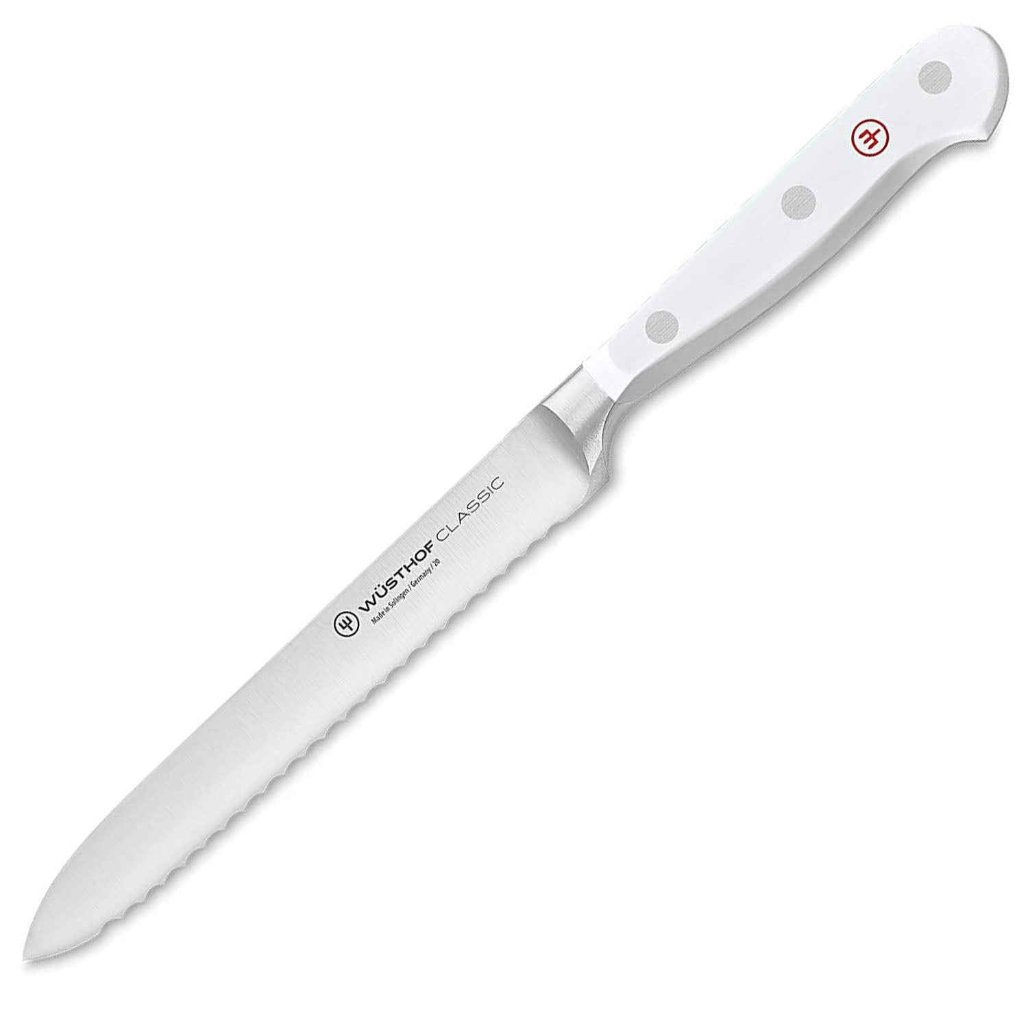 • UTILITY KNIFE The Classic White 5” Serrated Utility Knife is perfect for preparing a packed lunch or prepping ingredients for a large brunch. With its fine serrated edge, this knife cuts cleanly through bread, cheese, tomatoes and charcuterie meat. The blade is designed to easily slice through ingredients with a tough exterior and soft interior.